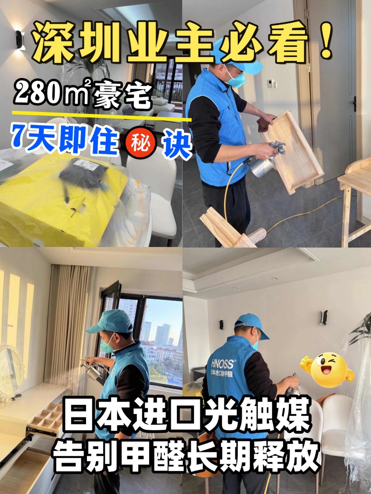 HNOSS:日本进口光触媒为什么深圳那么多业主选择HNOSS ①日本进口光触媒溶液:我们进口日本可视光光触媒溶液。区别于国产光触媒,粒径更小,附着力更强,同时在不需要紫外线光的条件下也能催化分解,解决了夜晚无光的痛点 ②甲醛长期释放的“终结者“:甲醛是长期释放的。我们的溶液喷涂后,会形成一层纳米级催化分解涂层,能渗透到板材内部分解源源不断释放的甲醛,能够覆盖甲醛的释放周期问题 ③本地化治理:HNOSS拥有全国各大城市的治理案例,针对深圳潮湿、温差大的气候,我们在施工时还进行特殊化手法治理,雾化速度也和其他城市有所差异。 - 本次分享案例 坐标:深圳宝安·冠城世家玉龙轩 面积:280平米 类型:新房装修 入住:7天 服务区域:全深圳区域可服务 治理经验:本地团队治理经验10多年,经验丰富